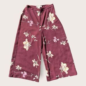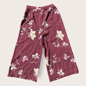 Maroon base with white and pink floral details throughout. Relaxed wide leg cut capri fit. High waisted flattering silhouette. Secures with a zipper on the side of the pants.