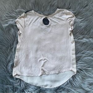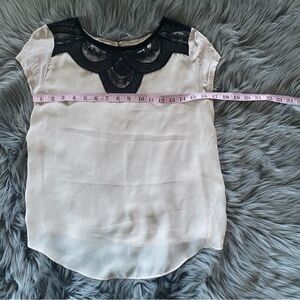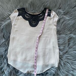 Lauren Conrad Lace Chiffon Top, S great used condition, has button keyhole back and cute lace detail at neck. See pics for measurements! Great little professional top for the office!