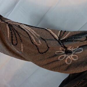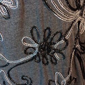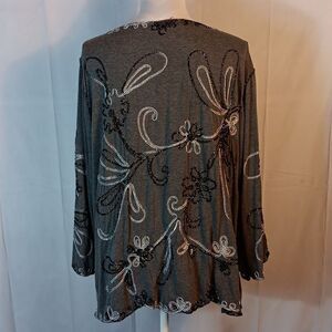 This gray with black and metallic stitching long sleeve v-neck Lauren Michelle Women top is a size 3X with a pit to pit measuring 27" and a length of 29". In excellent condition. All offers are welcome.