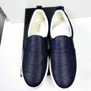 Lauren Ralph Lauren Blue Haddley Leather Trim Straw Sneaker Slip-on Size 8 NWT