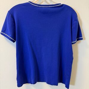 Classic Lauren Ralph Lauren short sleeve top in a vibrant royal blue with white contrast trim along the neckline and sleeves. Timeless style that pairs well with jeans, shorts, or skirts for an effortless casual look.