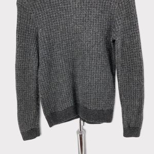Lovely and warm sweater jacket, full zip up the front, tonal grey houndstooth, collared, functional front zip up pockets, ribbed at neckline, cuffs of long sleeves and hem.