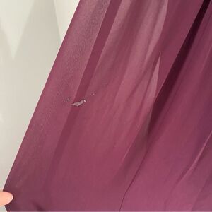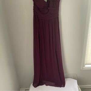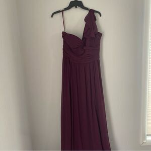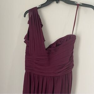 One shoulder. Ruched. Zipper closing on the back. Wine color