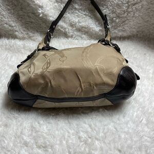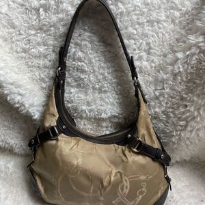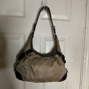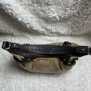 Lauren Ralph Lauren gold fabric logo satchel with black leather trim & strap silver tone hardwares top zipper the inside lining has a side compartment a side zipper two side pockets pre owned in good used condition see all pictures any questions please message.G6