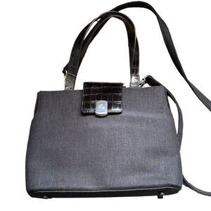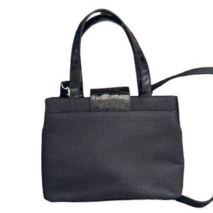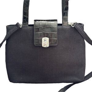 Made of canvas with crocodile design black leather double handle and flap snap cover