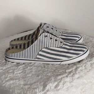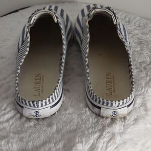 These Lauren Ralph Lauren blue and white striped slip-on sneakers are a size 8B. They have cushioned insoles for comfort. Pre-owned and in excellent condition. All offers welcome.
