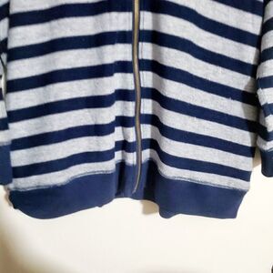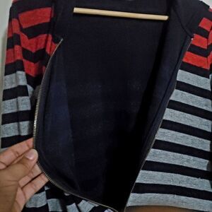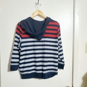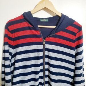 Gray,navy, and red striped sweater. It has a hoodie, and front zip up closure detail. Pre-owned in fair good used condition. Size not available. Best guess it's a size Large. Please refer to pictures, and measurements for best description, condition verification, and fit.