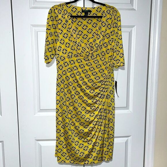 Bright yellow with black and white design Lauren, Ralph Lauren dress. Cinched side with cross over neckline. Very sexy! NWT size 16