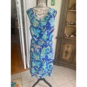 Lauren by Ralph Lauren Aleera Blue Paisley Jersey Cowl Neck Dress size medium. Blue Multi Aleera Cowl Neck Dress. Cowl neck jersey sheath. Blue floral / paisley multi color. by Ralph Lauren. Shelf bra lining a bust. Thin tie around belt. 96% Polyester / 4% Elastane. Although that will vary depending on the fit or style of the item.