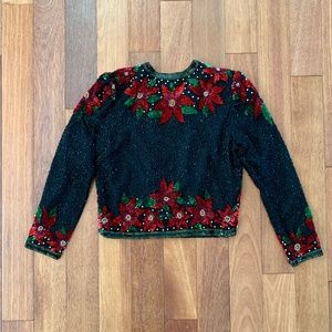 Laurence Kazar silk sequin and beaded evening jacket or cardigan in black with red and green poinsettias. Tagged Petite Small, fits standard womens size XS. See measurements below. Good preowned condition with no notable flaws.
