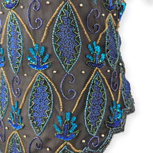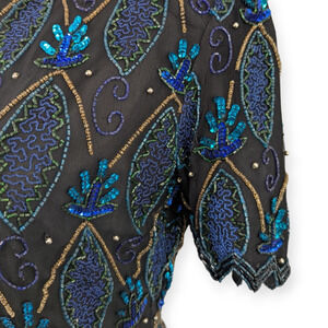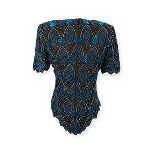 Laurence Kazar Black Beaded Silk Evening Top Size Small Petite Short Sleeves