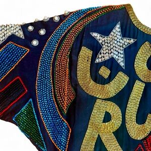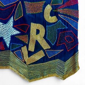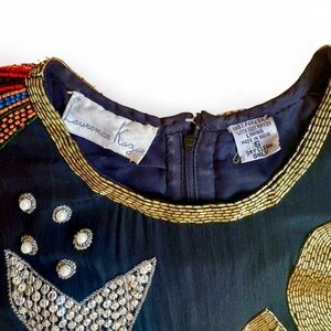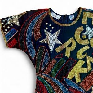 Vintage Lawrence Kazar beaded one of a kind party dress. This is a piece of art! So unique and detailed. Black shift dress with insane hand beading! Multicolor explosions of stars & letters & abstract shapes. Stunning piece. No holes or pulls- in near perfect condition. Back zipper& fully lined. Labeled size 6.