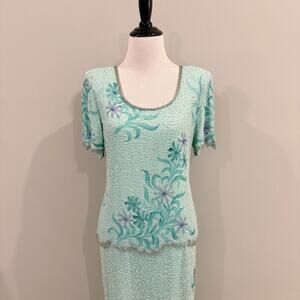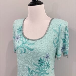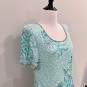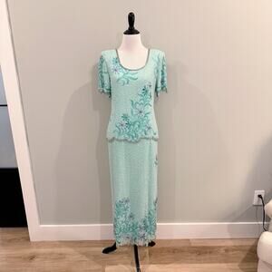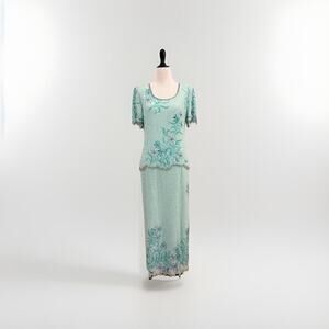 Laurence Kazar Full Beaded Silk Gown Womens Petite Size 10P Green Floral Formal