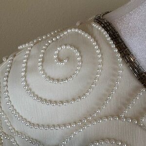 Laurence Kazar New York 100% Silk Vintage Angled Ivory Formal Evening Tiered Wedding Long Sleeve Midi Dress with Pearl Like and Silver Beading Accents; Lined; Full Back Zipper Closure; Size Medium; When lying flat, measures 20.5" pit to pit and 38.5" in length from back center neckline to bottom center hemline; Fabric composition shown in pictures; Reverse Side of tag states "Do not wash, Do not dry clean, Spot clean only"; Slight discoloration of neckline beading, front center brown like stain, and dark discoloration at top of back zipper neckline (shown in last 3 pictures)