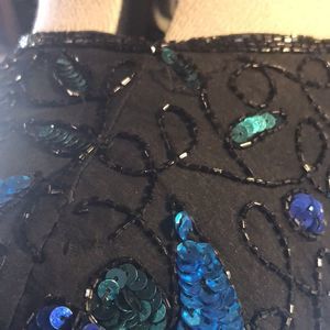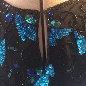 Evening attire, party blouse is completely beaded in black, blue, and green. short sleeves. Scallop edged on sleeves and hem. Hook and eye neck closure. Lined in polyester.