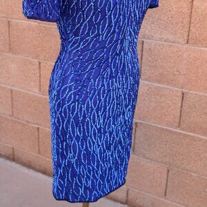 Laurence Kazar Silk Dress Womens SP Royal Blue Sequined Beaded Cocktail 90s