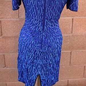 This is Stunning and Sexy Bright Cobalt Blue Sequin Beaded Lattice Pattern Silk Dress by Laurence Kazar, short sleeve vintage 1980-90s. The fine glitter fabric is designed to give you extra sparkle and charming. Show your figure perfectly with this bodycon dress.