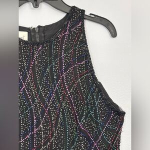 Elegant black blouse with colorful beadwork. Features intricate patterns in pink, blue, and green. Sleeveless design. Perfect for evening wear.