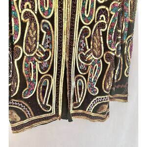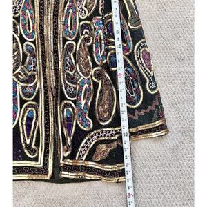 Item is in excellent preowned condition- please see pictures. A few missing sequins and beads but nothing major/noticeable. Fabric tag is missing but fabric is sequins/beads on silk. Lined.