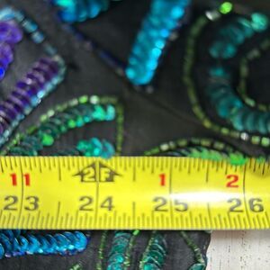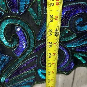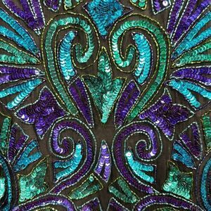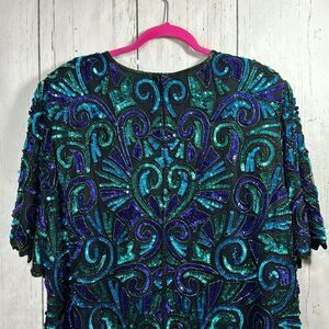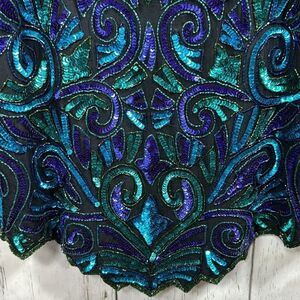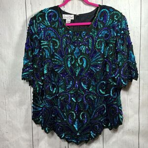 A stunning vintage Laurence Kazar silk sequin top in rich jewel-tone blues, greens, and purples. Fully hand-beaded with intricate scrolling patterns and a scalloped hem. This statement piece is perfect for holiday events, New Year’s Eve, or any special occasion. Rare plus-size 3X and in beautiful condition — a true vintage showstopper.