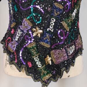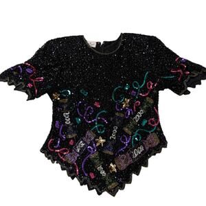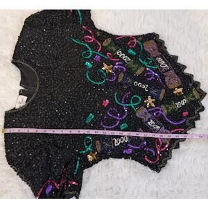 Iconic vintage Laurence Kazar fully beaded and sequined evening top featuring bold “2000” Y2K millennium motifs, colorful candy and ribbon beadwork, and a dramatic scalloped hem. Dense black sequins give this piece serious sparkle, making it perfect for New Year’s Eve, holiday parties, cocktail events, & statement night-out looks. Structured silhouette w/ short sleeves, back zip closure, & shoulder pads.
