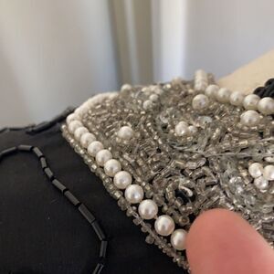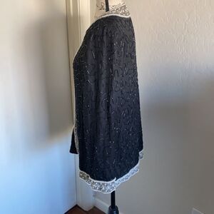 Black sequin with beaded style, vintage Laurence Kazar jacket, size large, please note: has missing beads, wear and missing embellishments. Hook-and-eye closure, view all photos for best representation.