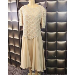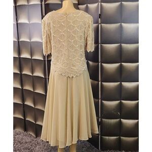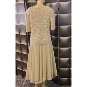 100% polyester beaded crew neck short sleeve. Mother of the bride dress.