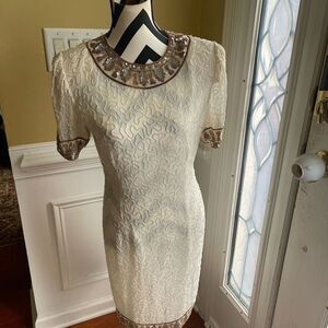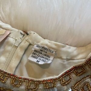Laurence Kazar Ivory Silk Beaded dress with gold and red beaded trims SZM back zipper.Pre owned in good used condition no noticeable missing beads see all pictures any questions please message.