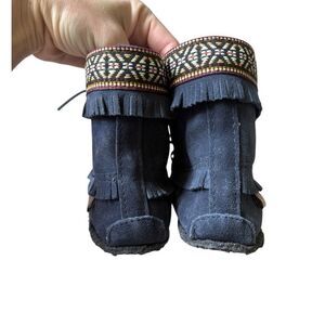 Laurentian Chief Canada Moccasins Suede Ankle High Boot Beaded Crepe Sole Size 6 Blue