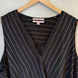 This is a beautiful black Laurie Felt tank draped blouse with silver asymmetrical stripes. It has a pintuck v-neck collar and a tucked under hem with a high low silhouette. This is beautiful to dress up or wear casually.