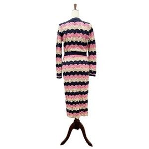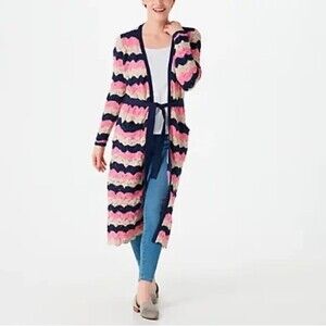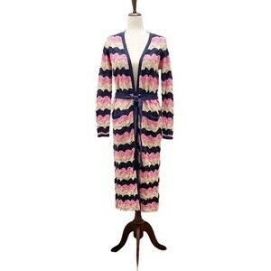 Laurie Felt Pointelle Knit Maxi Cardigan Duster Sweater Navy Pink Tan Size XXS