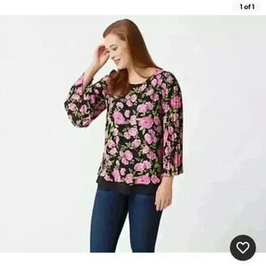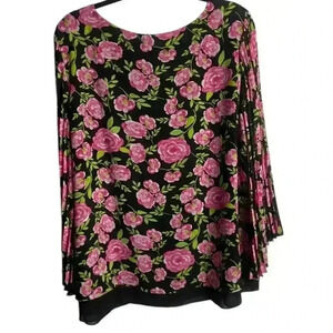Laurie Felt Size 1X Floral Printed Woven Blouse Pleated Sleeves Pink Black Flowy