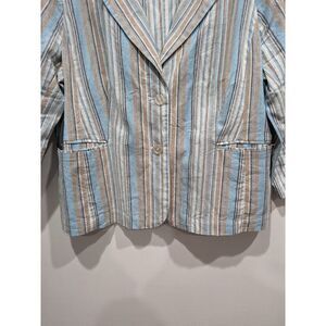 Coastal charm embodies this linen blend blazer in soft neutrals and turquoise blue stripes.