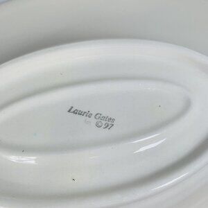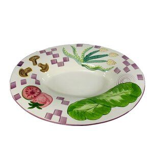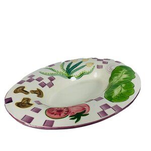 Laurie Gates Oval Ceramic Bowl Heavy Vintage 1997Hand Painted Vegetable Design Purple Checkerboard