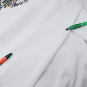 A few spots including one on the cuffs, a couple on one sleeve, and one on the front near the hem - check out the photos with the pen for more specifics