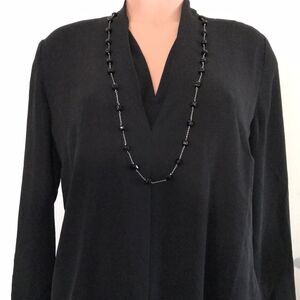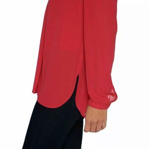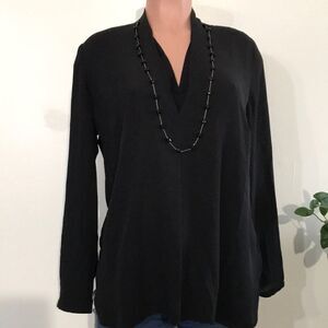 Features: layered V-neck style, pleat down middle, long sleeves, button-closure cuffs, side slits at hem