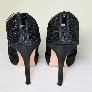 Laurine Lorraine Embellished Black Open Toed Booties, 8. Beautiful beading and lace details. Zips up the back. 4.5 inch heels. Worn once.