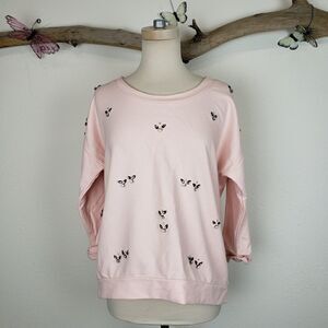 Long sleeve Jersey knit top with oversized jewels. Some tiny ones missing in front but you cant tell they were ever there. See pictures. SO cute and soft. Scooped hem, hi low