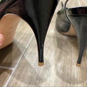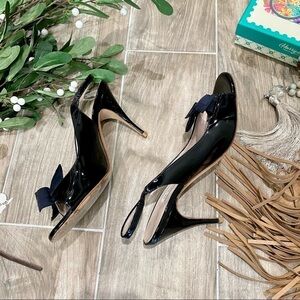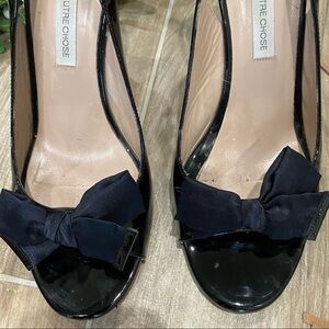 L’Autre Chose black patent leather sling back stiletto heels with dainty bow accent across the toes. Some mild wear pictured to the right heel and outside bottom soles. Lots of life left in these luxury shoes.