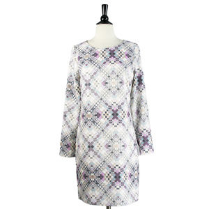 Multi color geometric print dress with round neckline, long-sleeves and an A-line silhouette with a cream background and print in shades of green, gray, pink and purple. Fully lined.
