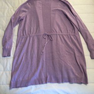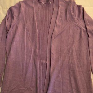 This lavendar cardigan is made out of 71% rayon and 29% polyester. It is 33 inches long with a pit to pit measure of 23 inches. It is made out of stretchy materials and is in great condition with no rips, tears or stains.