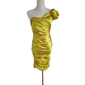 Vera Wang Lavender Label Yellow One Shoulder Ruched Satin Dress. Figure enhancing ruching sculpts the single shoulder sheath dress in a lustrous satin