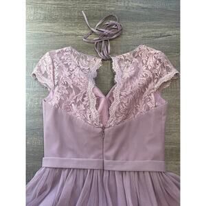 Elegant lavender v neck dress, perfect for a bridesmaid or prom. Beautiful lace sleeves add a touch of sophistication. The dress is in great condition and ready to make your special occasion even more memorable. Don't miss out on this stunning gown!