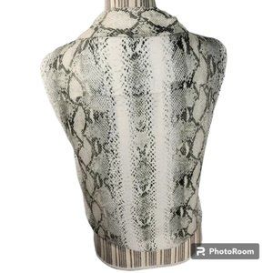 Lavender Brown, Ivory & Black Snakeskin Print, Sleeveless, Button Down Top. Size Medium. 100% rayon. Collared. V neck. Ties at the front hem. Comes with an extra button. Cute top. Gently used. No holes or stains. Smoke free home. Armpit to armpit measures 19". Shoulder to hem measures approximately 19".