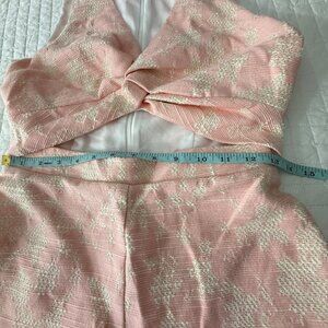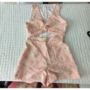 Chic sleeveless romper featuring a textured floral pattern in pink and cream, with a cutout waist and back zip for an elegant yet playful look.