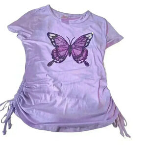 Brand new, never-worn lavender short-sleeve t-shirt featuring a stunning butterfly graphic with purple and black sequins. Soft and comfortable, perfect for a casual, stylish look.