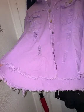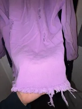 Light lavender distressed button-up jacket. Front flap pockets and raw hem details. Casual, oversized look with worn accents. Soft, pastel purple color. There isn’t a tag but it’s definitely a size large and in good condition.