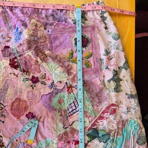 This handmade A-line skirt is a wearable dream, perfect for anyone who loves romantic vintage fashion. A true work of art, this skirt features a crazy-quilted front that’s a beautiful patchwork of repurposed vintage materials, from delicate rose prints and intricate embroidery to shimmering beadwork. It's a one-of-a-kind statement piece.