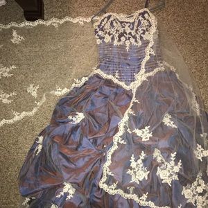 This dress is a fairytale dream come true. It’s a lavender ball gown with lace flowers and beads. In the back, it laces up which adds to the fairytale fantasy. This dress also comes with a matching shawl that completes the classic look. It’s been worn once for 2 hours and yet it’s still in great condition! The size it a 4/6