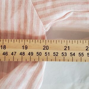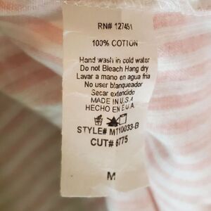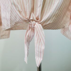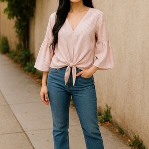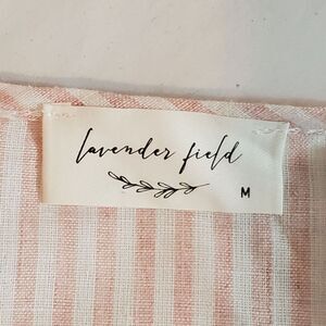 Lavender Field womens cotton shirt in size M features a soft pink and white design with tie-front detail, flattering V-neck, and flowy bell sleeves. Lightweight and comfortable, this versatile blouse is perfect for casual wear, work, or summer outings, offering effortless boho style with a feminine touch.